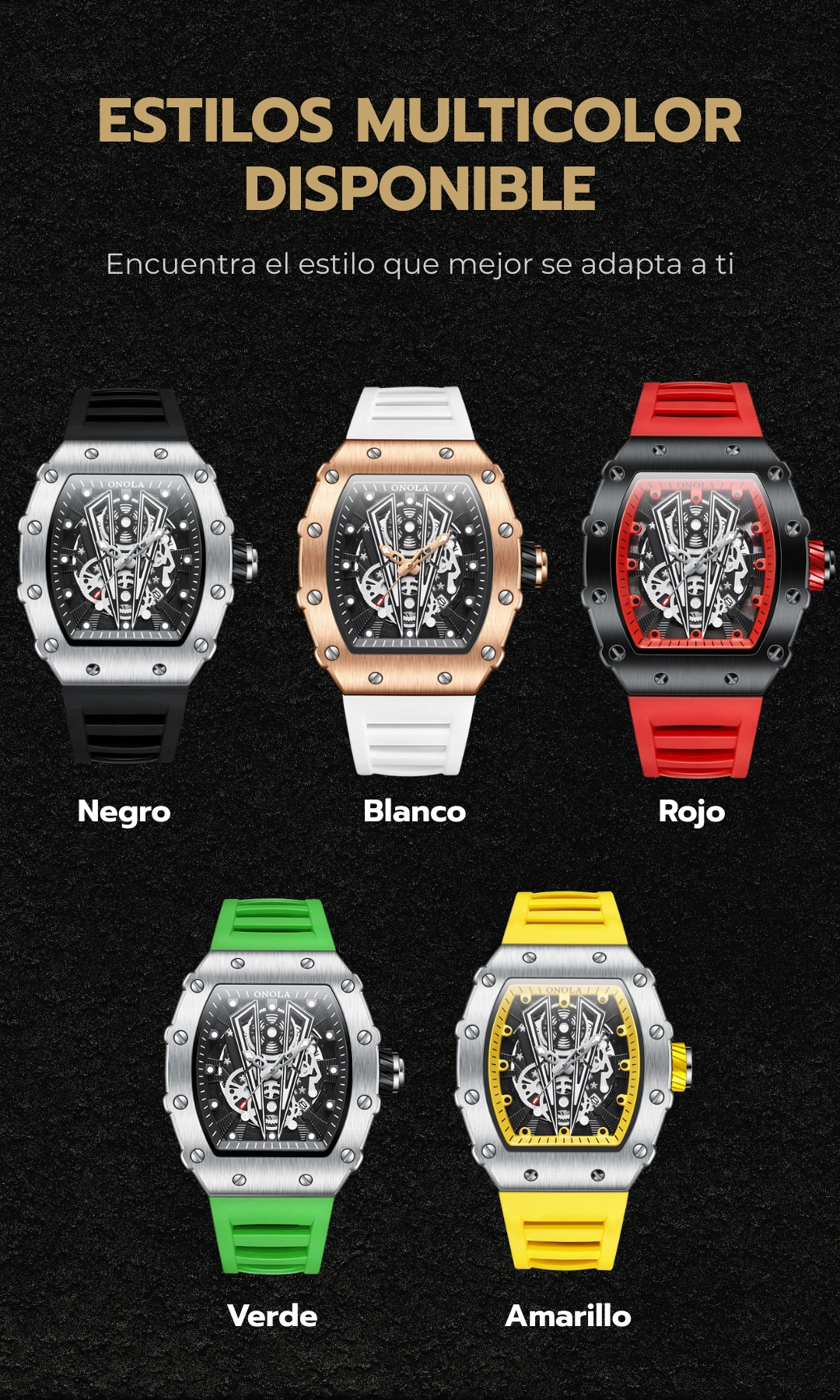 El reloj está fabricado con aleación de acero y correa de silicona/goma/acero inoxidable, lo que garantiza resistencia y comodidad.